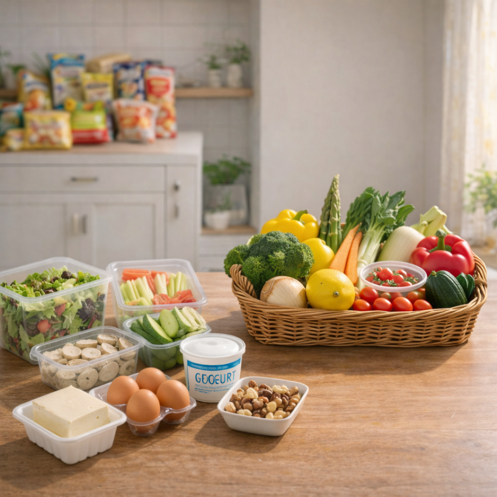 사람은 의지가 강할 때보다, 선택지가 단순할 때 더 잘 지킵니다. 그래서 가공식품 줄이기의 핵심은 디폴트를 바꾸는 겁니다. 예를 들어 배고플 때 바로 먹을 수 있는 것이 라면이면 라면을 먹게 되고, 바로 먹을 수 있는 것이 삶은 달걀+과일+요거트면 그쪽으로 흘러갑니다. 즉, 배고픈 상태에서 결정을 하지 않게 만드는 것이 중요합니다. ‘바로 먹을 수 있는 건강한 옵션’이 집에 있느냐가 사실상 승부를 결정합니다. 그래서 본격적인 식단 계획보다 먼저 해야 할 일은 “비상식 세트”를 만들어두는 것입니다.